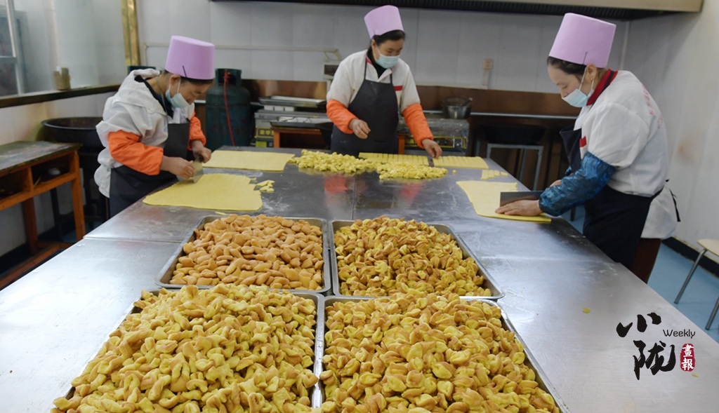 巾幗扶貧車(chē)間里婦女們正熱火朝天制作著花馃馃。形狀多樣的花馃馃在鍋里上下翻騰,彌漫著誘人的沁香。