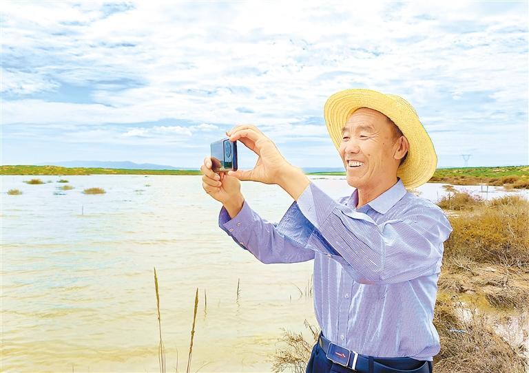 八步沙林場場長郭萬剛在“紅沙湖”畔拍照。新甘肅·甘肅日報(bào)記者 金奉乾