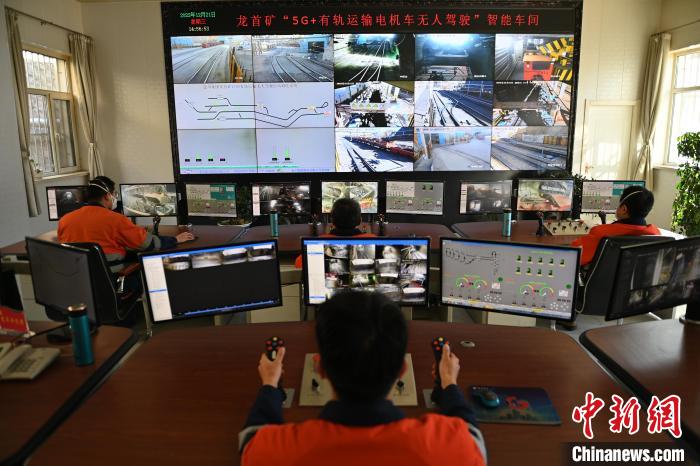 圖為金川集團龍首礦“5G+有軌運輸電機車無人駕駛”智能車間內,操作員正在進行遠程控制?!?/p>