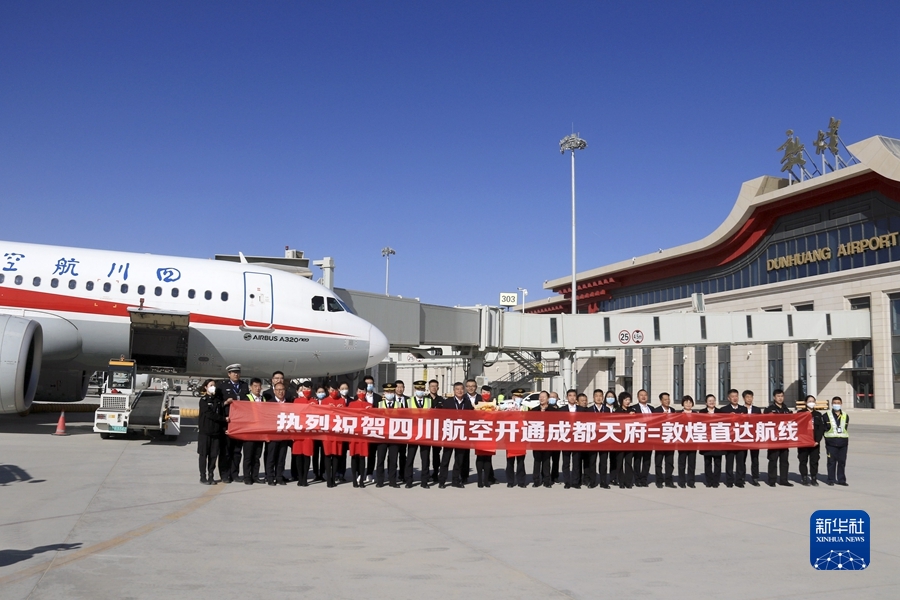 3月26日,由四川航空公司執(zhí)飛的成都至敦煌往返直達(dá)航線正式通航。這是首航航班機(jī)組人員與機(jī)場(chǎng)工作人員在甘肅敦煌莫高國(guó)際機(jī)場(chǎng)合影。新華社發(fā)(張曉亮攝)