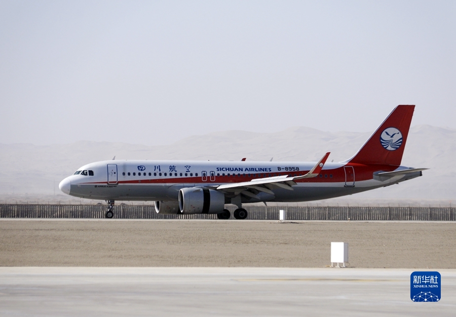 3月26日,由四川航空公司執(zhí)飛的成都至敦煌往返直達(dá)航線正式通航。這是首航航班降落在甘肅敦煌莫高國(guó)際機(jī)場(chǎng)。新華社發(fā)(張曉亮攝)