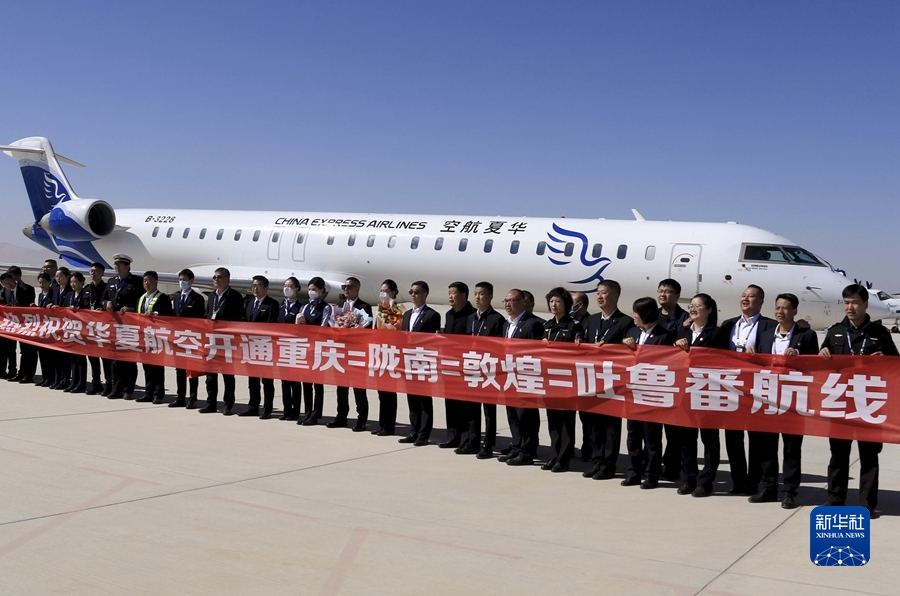 3月26日,由華夏航空?qǐng)?zhí)飛的重慶-隴南-敦煌-吐魯番往返航線正式通航,這是首航航班機(jī)組人員與機(jī)場(chǎng)工作人員在甘肅敦煌莫高國(guó)際機(jī)場(chǎng)合影。新華社發(fā)(張曉亮攝)