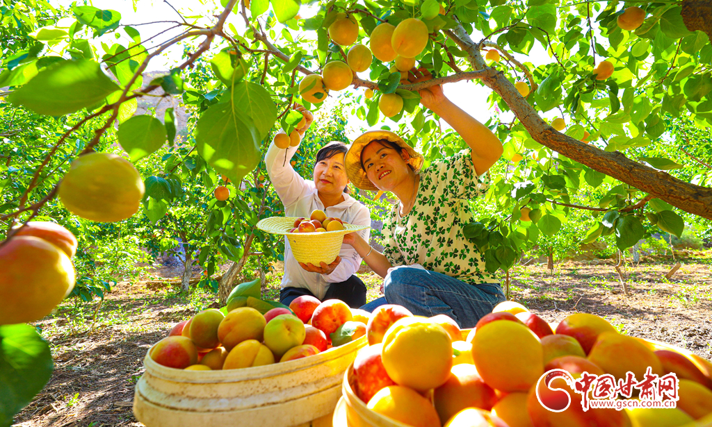 6月13日,張掖市臨澤縣板橋鎮(zhèn)友好村村民正在自己的杏園中采摘大黃杏,杏園過(guò)去的位置是一片大沙丘。
