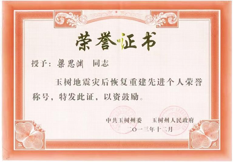 他一直這樣嚴于要求自己。因在格薩爾王賓館地震遺址維修保護項目中作出突出貢獻,梁思淵被玉樹州委、州政府評為“玉樹地震災后恢復重建先進個人”。疫情期間,他主動請纓,參與雁南路街道防疫物資運輸保障任務,轉運物資總計150多趟次。