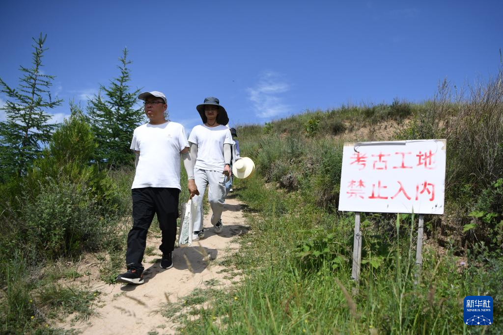 四角坪遺址考古領隊、甘肅省文物考古研究所副研究館員侯紅偉(前)帶領考古專業(yè)研究生在甘肅省隴南市禮縣四角坪遺址考古發(fā)掘現(xiàn)場工作(2022年6月10日攝)。新華社記者 郎兵兵 攝