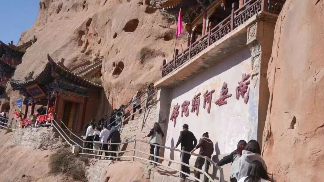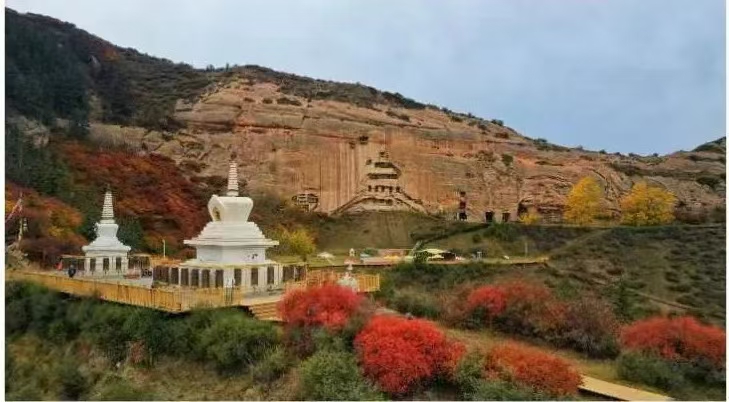 18日上午,迎著耀眼的晨光,采訪團成員乘坐大巴車來到了集自然風(fēng)光、石窟藝術(shù)、民族風(fēng)情、宗教文化于一體的肅南馬蹄寺。馬蹄寺是河西走廊著名的佛教勝地,石窟群開鑿于十六國北涼時期,距今約1600年的歷史,是絲綢之路上至關(guān)重要的歷史文化瑰寶,也是我國早期石窟的杰出代表。秋日的馬蹄寺,秋高氣爽,景色宜人,遠(yuǎn)遠(yuǎn)看去,紅綠相間,層林盡染,大家行走在落葉飄零的山間小路上,對這座建在懸崖峭壁之上、將棧道鑲嵌在山體之內(nèi)的石窟充滿了好奇。