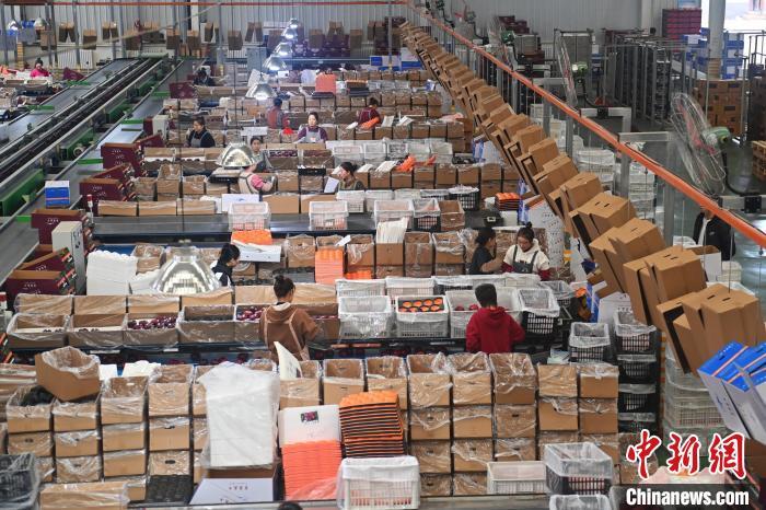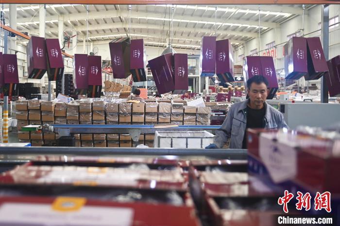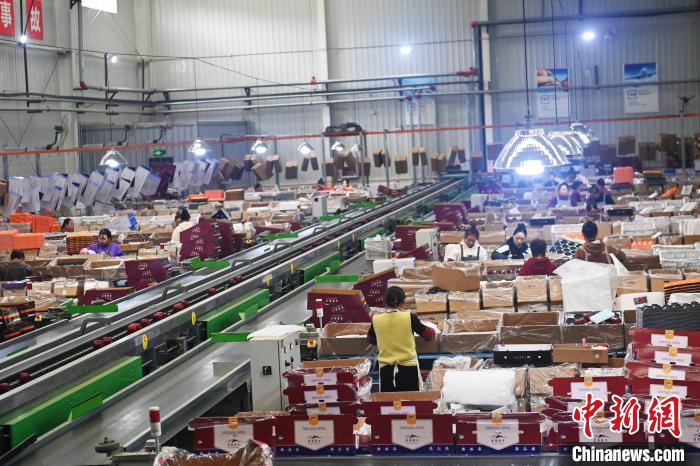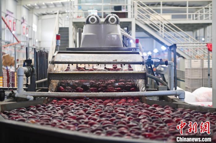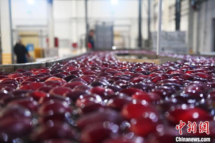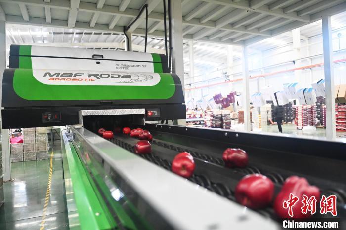 10月21日,在甘肅省天水市秦安縣雪原果品有限公司加工車間,蘋果自動(dòng)化分揀線上工作人員進(jìn)行分揀工作。該生產(chǎn)線每天能處理30噸蘋果,蘋果經(jīng)過(guò)設(shè)備水洗、烘干、稱重等環(huán)節(jié),進(jìn)入不同等次的包裝線,工人們?cè)賹?duì)每顆蘋果進(jìn)行復(fù)檢、貼標(biāo),分裝在不同規(guī)格的包裝箱中。甘肅秦安蘋果總面積61.37萬(wàn)畝,產(chǎn)量86.8萬(wàn)噸,產(chǎn)值55.6億元人民幣,先后從國(guó)內(nèi)科研院所引進(jìn)青砧、M26、ZH5等抗重茬蘋果矮化砧木6個(gè),配合國(guó)家蘋果產(chǎn)業(yè)技術(shù)體系,引進(jìn)長(zhǎng)富2號(hào)、煙富6號(hào)、煙富8號(hào)、瑞香紅等蘋果新品種12個(gè)。中新社記者李亞龍攝