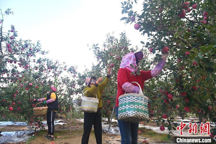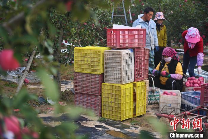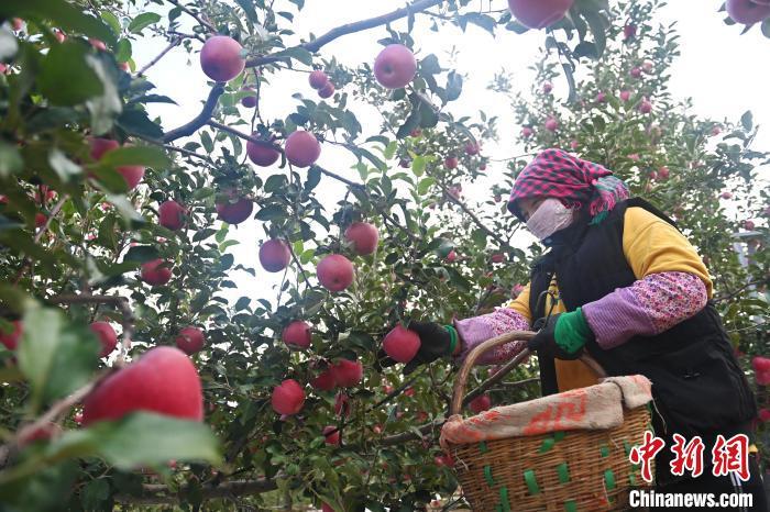 10月21日,在甘肅省天水市秦安縣一果園內(nèi),果農(nóng)進(jìn)行蘋果采收工作。中新社記者李亞龍攝
