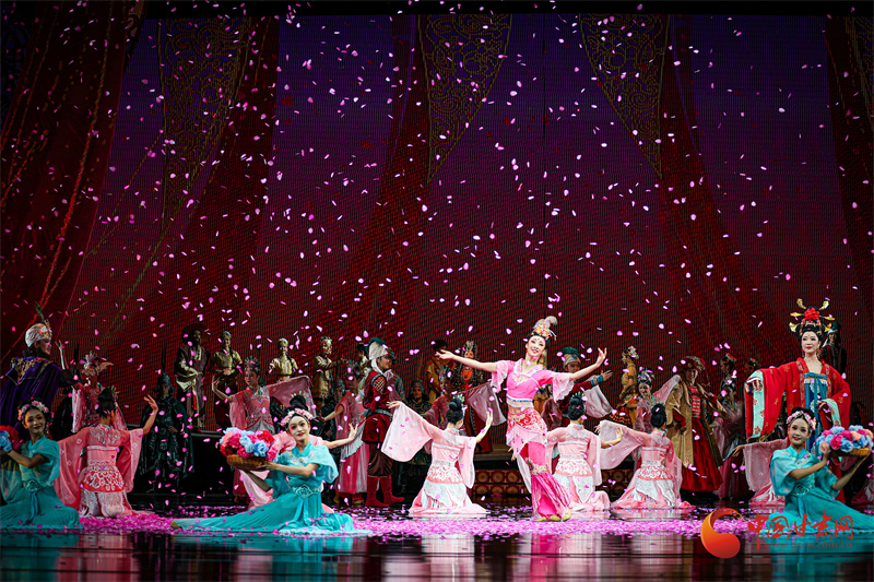 當(dāng)全息投影將莫高窟壁畫在舞臺(tái)上緩緩展開,當(dāng)駝鈴聲與電子樂編曲交織出跨越時(shí)空的和弦,觀眾相信,所謂“傳統(tǒng)”從不是凝固的標(biāo)本,而是流動(dòng)的生命,正如劇中穿越千年的花雨,落在古代畫工的筆端,落在當(dāng)代舞者的袖間,浸潤海內(nèi)外每一位觀演者的心田。劇中描繪的中外友好通商、民心交融場景,更是對(duì)新時(shí)代“一帶一路”倡議的生動(dòng)詮釋。(甘肅省文化旅游廳供圖)