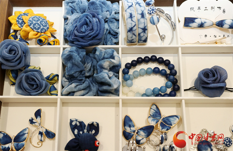 染好的布匹還要經(jīng)過脫漿、清洗、陰干,最后才是拆線、整理。當(dāng)一塊完整的藍(lán)印花布展現(xiàn)在眼前時(shí),李梅總會(huì)輕輕撫摸布料,仿佛在與草木對(duì)話。她的工作室里,掛滿了用藍(lán)染制成的物件:桌布上印著成片的板藍(lán)根葉,茶席邊緣綴著小巧的藍(lán)染布扣,就連她日常穿的棉麻衫,也是自己染的淡藍(lán)色。“這些布不是冰冷的商品,是帶著土地溫度的生活。”李梅說,去年她在平?jīng)龉懦情_了一間“藍(lán)染生活館”,游客可以跟著她學(xué)種板藍(lán)根、體驗(yàn)扎染,很多人第一次發(fā)現(xiàn),原來衣服上的藍(lán)色可以來自田野,非遺技藝能如此貼近日常。