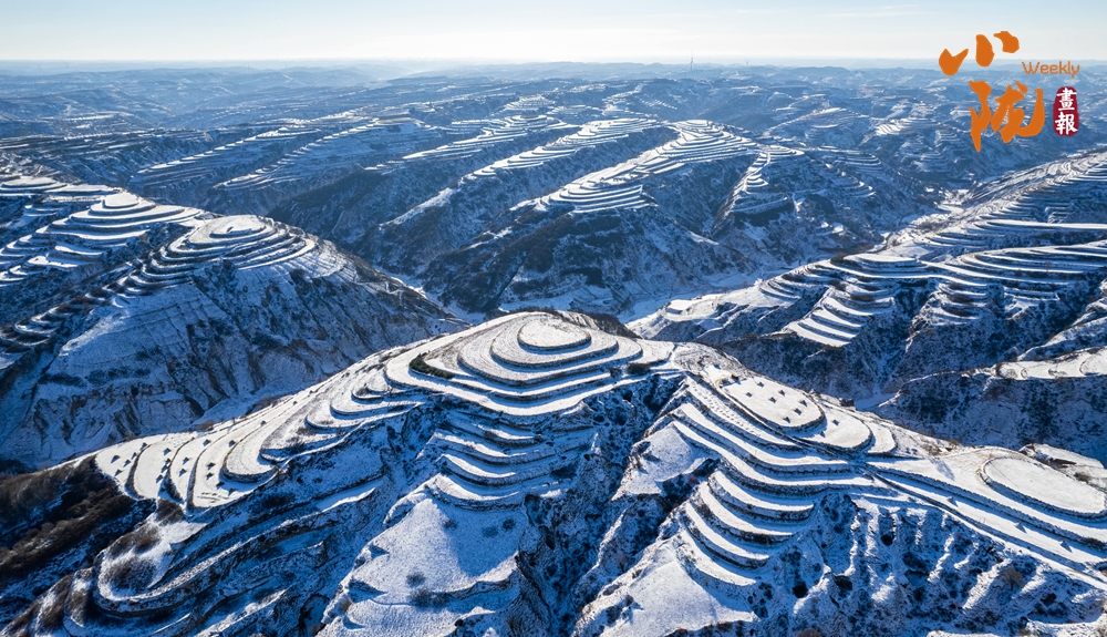 俯瞰雪后華池,溝壑縱橫的黃土高原披上銀裝,陽光斜照雪野之上,投下深淺交錯的光影,靜謐中流轉著溫柔的明暗,純凈而遼遠。