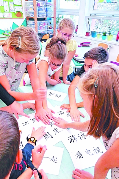 在匈牙利首都布達佩斯,匈中雙語學(xué)校的學(xué)生在課堂上復(fù)習(xí)漢語生詞。新華社發(fā)