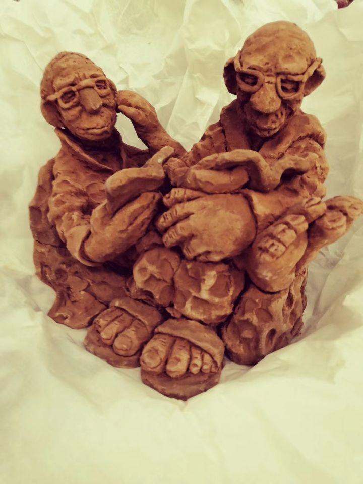 一個(gè)人的藝術(shù)成就,在多個(gè)領(lǐng)域里綻放,是一件難以置信的事情。劉老師的泥巴,玩出了她自己的風(fēng)采。三盆泥巴,事先由主辦方備制好。像和面一樣,醒泥巴,摔泥巴,軟硬適宜。人還沒(méi)到合作,泥巴早已備好。