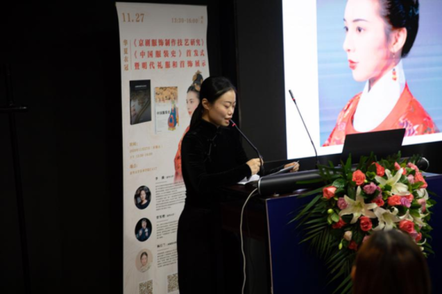 風(fēng)陵渡金銀器復(fù)原工作室首席設(shè)計師楊汀蘭向大家介紹了明代禮服以及明代經(jīng)典首飾的制作工藝,并現(xiàn)場通過模特展示了明代首飾的佩戴方法和整體造型。最后,與會專家還圍繞兩本新書展開了學(xué)術(shù)研討和交流,分別從不同角度對這兩本書進行了探討。