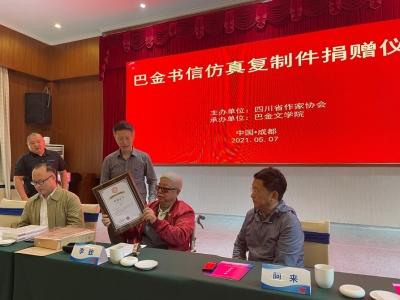 捐贈(zèng)儀式由四川省作協(xié)黨組書記侯志明主持,省作協(xié)主席阿來致辭。省作家協(xié)會(huì)向李致頒發(fā)了收藏證書。詩(shī)人黎陽(yáng)現(xiàn)場(chǎng)朗誦了巴金大哥寫給巴金一封信的選段,內(nèi)容充滿情感,令人動(dòng)容。朱丹楓、廖全京等文藝界人士,以及巴金多位親屬出席了捐贈(zèng)儀式。