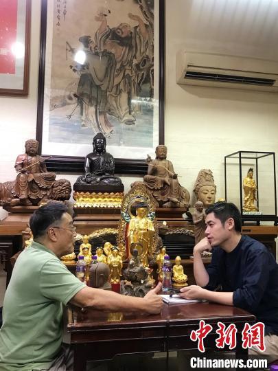 圖為葛亮(右)采訪澳門木雕佛像非遺傳承人 人民文學(xué)出版社供圖