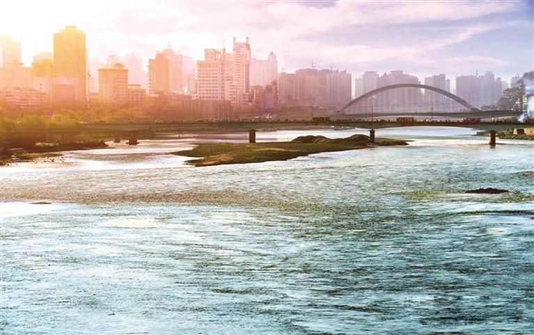 河分南北,勢接?xùn)|西。舒寧陜之博帶廣袖,帶青藏之峨冠雪衣。山逶迤而續(xù)祁連,水澎湃而瀉右?guī)?。匯洮湟之迤邐,有容乃大;與華夏之康莊,唇齒相依。控河西走廊,自古而始;俯渭涇秦川,由朝至夕。綴葫蘆狀岸渚坪灘,幾多古渡;依膏腴處坡谷盆地,即就蕃息。筑虹蜺經(jīng)百年,鐵橋第一;盤游龍於今朝,立交數(shù)十。去病鞭地,五泉山勝于秀逸;永誠建院,白塔寺高于云齊。指點九州,大禹登九州之臺;漂流黃河,洋人恐招手之磯。草覆馬銜而能牧,林茂興隆云可棲。繞營盤高嶺排五,峙雄關(guān)沿河有七。留千古名,白馬浪細聽湍流不息;鎖萬代鑰,金城關(guān)只留站牌不奇。雷壇留碑,金天觀曾殿宇壯麗;華林無寺,節(jié)能燈照幽路石基。湍流黃河,九曲回腸依然東去;水轉(zhuǎn)輪盤,十方高地亦滿紛披。