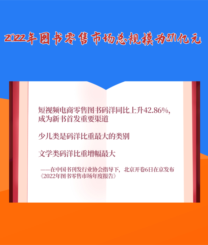 1月6日,在中國書刊發(fā)行業(yè)協(xié)會(huì)指導(dǎo)下,北京開卷信息技術(shù)有限公司在京發(fā)布《2022年圖書零售市場年度報(bào)告》。報(bào)告顯示,2022年我國圖書零售市場碼洋規(guī)模為871億元。短視頻電商零售圖書碼洋同比上升42.86%,碼洋占比趕超實(shí)體書店,成為新書首發(fā)重要渠道。