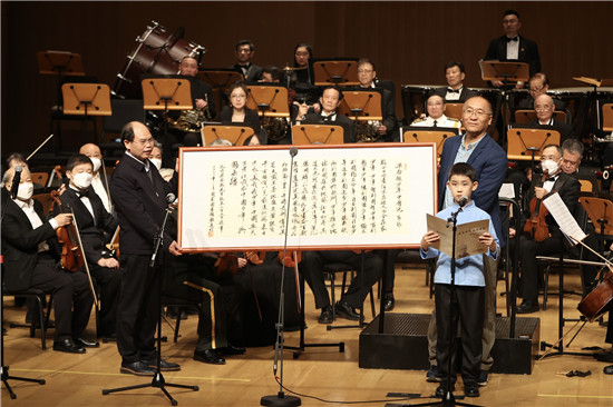 2月23日,北京,“前哲垂范 文津日新”——梁?jiǎn)⒊Q辰150周年紀(jì)念配樂(lè)朗誦音樂(lè)沙龍?jiān)趪?guó)家圖書館舉行。中國(guó)國(guó)家圖書館館長(zhǎng)熊遠(yuǎn)明(左)向梁?jiǎn)⒊笕速?zèng)手書《少年中國(guó)說(shuō)》。 蔣啟明/攝