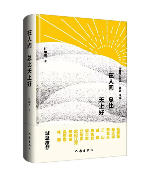 近日,江耀進詩選《在人間總比天上好》由作家出版社出版。詩選共收入作者近三年來創(chuàng)作的247首詩歌作品,分為六集,即:“山河歲月”“生命瞬間”“塵世片斷”“城市鏡像”“日常觀照”和“感恩親人”。