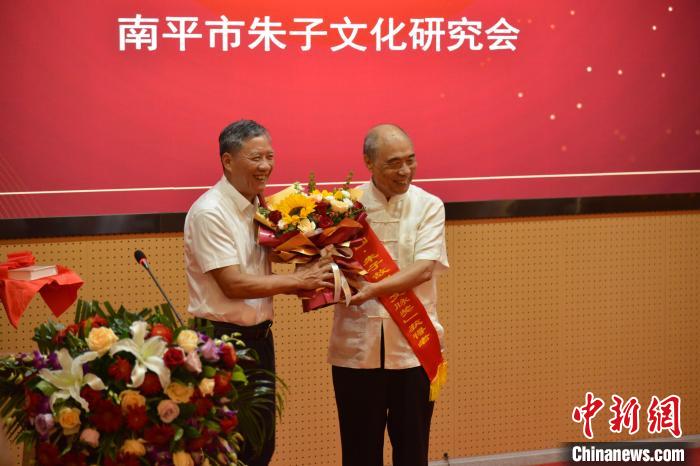 圖為第五屆“文脈獎”授予武夷文化研究院名譽院長吳邦才(右)?!∪~國寶 攝