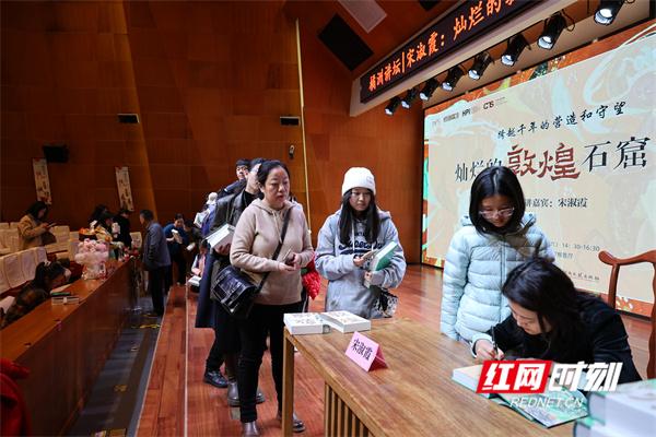 11月10日晚、11月11日下午,作為第二屆岳麓書會系列活動之一,由湖南文藝出版社舉辦的《“畫”中有話:敦煌石窟百講》新書分享會系列活動分別在長沙樂之書店一中店和長沙圖書館舉行。該書策劃人之一、敦煌研究院文化弘揚部副部長宋淑霞攜新書現(xiàn)身長沙,和讀者分享燦爛的敦煌石窟藝術(shù)。雖然天氣嚴(yán)寒,讀者熱情絲毫不減,兩場活動均獲得熱烈反響。