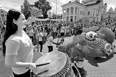 6月1日,白俄羅斯孔子學院師生在明斯克“茶和天下·雅集”活動上表演舞龍舞獅。新華社發(fā)