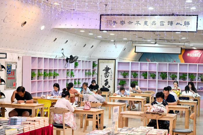 7月6日,福州新華書店鰲峰坊書城內(nèi)家長陪伴孩子讀書納涼。