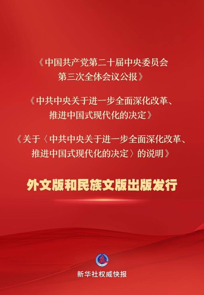 《中國共產(chǎn)黨第二十屆中央委員會(huì)第三次全體會(huì)議公報(bào)》《中共中央關(guān)于進(jìn)一步全面深化改革、推進(jìn)中國式現(xiàn)代化的決定》《關(guān)于<中共中央關(guān)于進(jìn)一步全面深化改革、推進(jìn)中國式現(xiàn)代化的決定>的說明》的英文、法文、西班牙文、日文、俄文、德文、阿拉伯文、葡萄牙文、越南文、老撾文等10種外文版已由中央編譯出版社、外文出版社出版,面向國內(nèi)外公開發(fā)行。