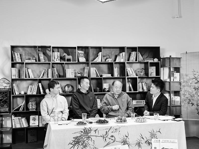 “在文學(xué)的曠野里”特別直播活動(dòng)現(xiàn)場(chǎng)。從左至右為讀者張志方、《人民文學(xué)》主編施戰(zhàn)軍、作家莫言、“與輝同行”負(fù)責(zé)人董宇輝。 陳濤 攝