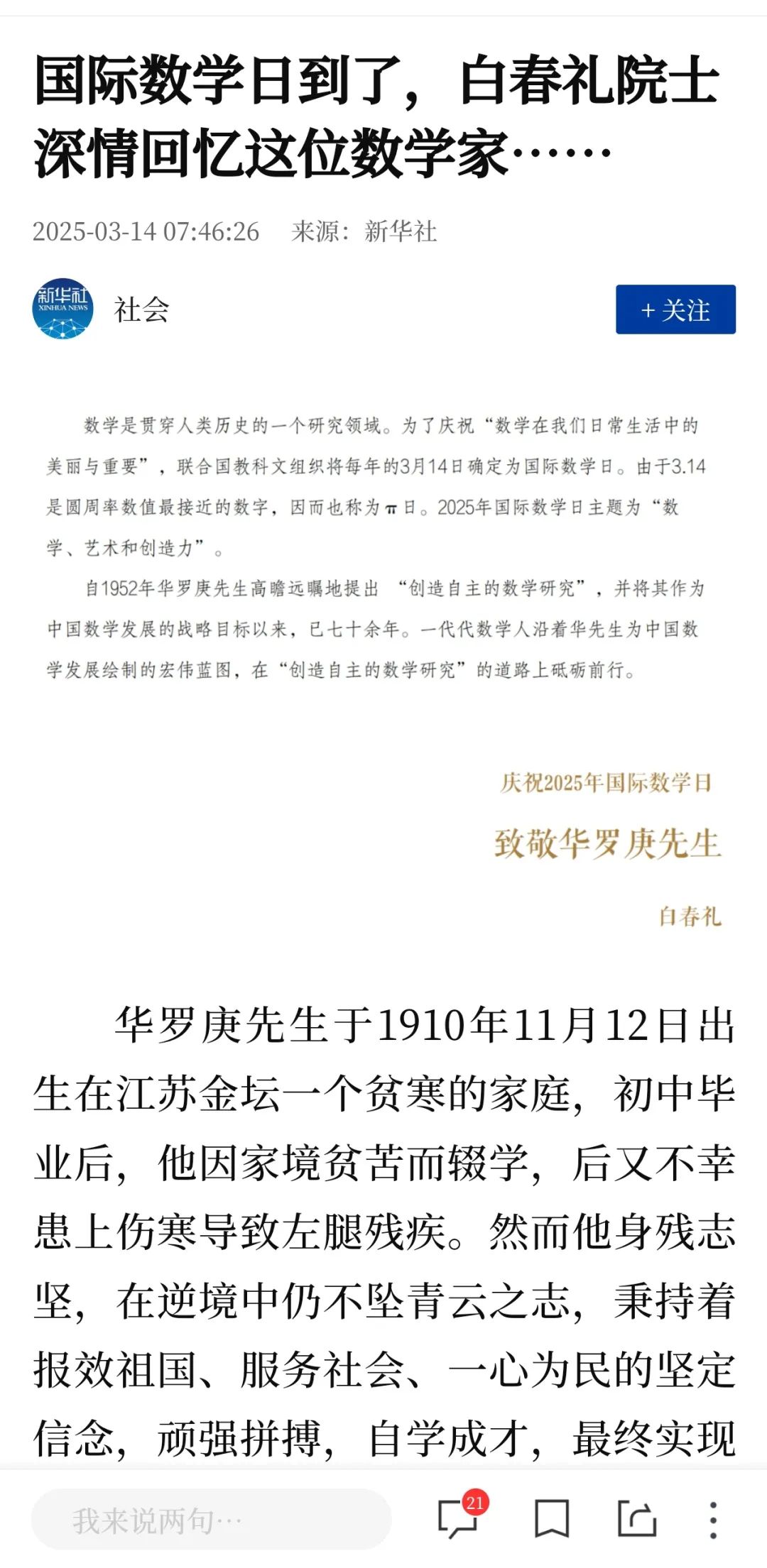 新版問世后,白春禮院士在新華社撰文《國際數(shù)學(xué)日到了,白春禮院士深情回憶這位數(shù)學(xué)家......》力薦本書,獲超150萬閱讀量。