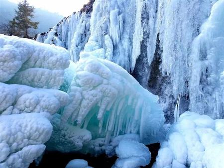 往前走,山和山之間的天顯得窄小了,抬頭,并沒有鷹飛過。懸崖峭壁上是一簾簾冰掛冰瀑,老天爺最寫意的畫作,是用白水晶,羊脂玉做成的。心里沸騰著歡喜,眼睛卻被這世界上最純凈的光芒刺出了淚,這凝固的千堆雪,這些白玉蘭,這些合歡樹,對嗎?不對。這些冰瀑,站在遠處和近處看到的物像都不相同,正面和側面觀看,更是形態(tài)各異。
