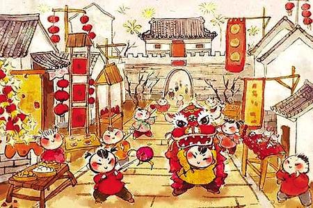 轉(zhuǎn)眼到了大年三十,俗稱“除夕”,黑河流域除舊迎新的主要活動(dòng),都集中在這一天進(jìn)行。父親一大早就帶我們揭去墻上的舊畫,貼上新買的年畫;窗戶蒙上新紙,貼上母親親手剪的窗花。母親勤勞淳樸心靈手巧,剪出的窗花有“孫猴子摘桃”“孔雀嬉牡丹”,特別是小豬、小狗、小老虎圖案,栩栩如生活靈活現(xiàn)。做完這一切,已經(jīng)到了晌午時(shí)分,父親便急急忙忙帶我們貼春聯(lián)、貼門神。父親說(shuō)門神是守護(hù)門庭的衛(wèi)士,左邊貼“白臉兒”,右邊貼“黑臉兒”,象征財(cái)源廣進(jìn)家道平安。我們將一副秦瓊和尉遲恭的門神,端端正正貼上莊門扇,滿院子紅紅的對(duì)聯(lián),滿屋子嶄新的年畫和窗戶上鮮艷的窗花,為節(jié)日披上了盛裝,喜氣洋洋。