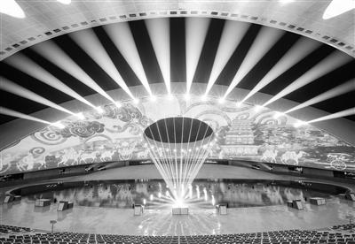 華夏文化展示中心分為展演區(qū)與展示區(qū)兩個(gè)部分,展示區(qū)為古鎮(zhèn)式商業(yè)街,目前已進(jìn)入收尾階段,展演區(qū)為大型激光水舞秀劇場(chǎng)——日月館,去年已試運(yùn)營(yíng),效果極佳。別名“黃河巨蛋”的日月館總用地面積為12000平方米,場(chǎng)館外形呈半橢圓形,由兩片獨(dú)立的頂棚覆蓋,場(chǎng)館高30米,寬約80米,內(nèi)設(shè)觀眾席位1450座。場(chǎng)館屋頂?shù)奶煅坶_口和場(chǎng)館地面體現(xiàn)了中國(guó)天圓地方的理念以及太陽(yáng)和月亮的互相映襯。外立面采用了與當(dāng)?shù)貍鹘y(tǒng)屋頂瓦片相呼應(yīng)的獨(dú)特形狀,又像鳥兒折疊的翅膀和羽毛,極富活力和寓意。