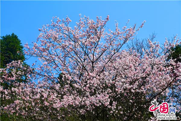 沿著蜿蜒的旅游公路,兩旁海拔600多米的山坡上開滿了櫻花,一簇簇櫻花投印在蒼翠山麓與柳綠間,潔白的、粉色的、玫紅的花朵,迎風(fēng)搖曳,儼然一副七彩水墨畫。