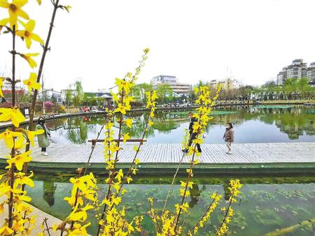 四月春日,五彩繽紛。小西湖公園里,迎春花、桃花等競(jìng)相開(kāi)放,引來(lái)蜜蜂、蝴蝶穿梭其中,微風(fēng)拂過(guò),飄來(lái)陣陣花香。清澈的湖水,嫩綠的草地,公園內(nèi)四處皆有春天的顏色。