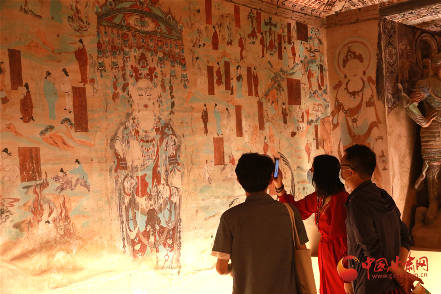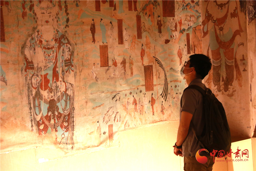 2020年5月18日,游客在甘肅省敦煌市博物館參觀文物展。
