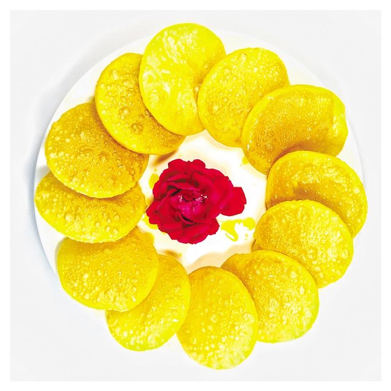 折橋?yàn)车拿媸持?,燙面油香的地位自比尋常,往往在冷熱拼盤交錯中,它已經(jīng)被端上桌,因?yàn)樗钦蹣驗(yàn)橙思抑凶罹呦笳饕饬x的一種食物。油香炸得好不好,就可以衡量出這家農(nóng)家樂廚師的技藝。