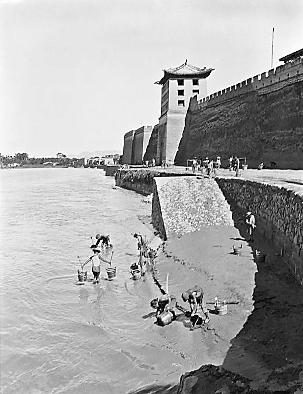 第二張是水客子在黃河中取水的情形。看起來,似乎是黃河大水之后,人們從河中取水。黃河邊的石堤下,堆積的淤泥,還沒有清理。以前,蘭州城墻的位置,就是今天的南濱河路。從淤泥堆積的高度看,這次黃河大水應(yīng)該不小。
