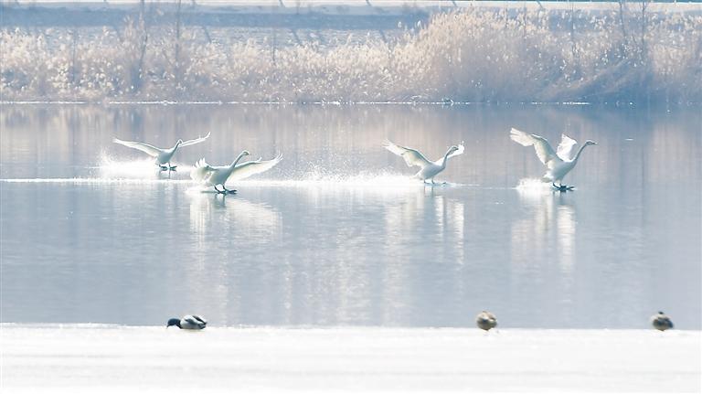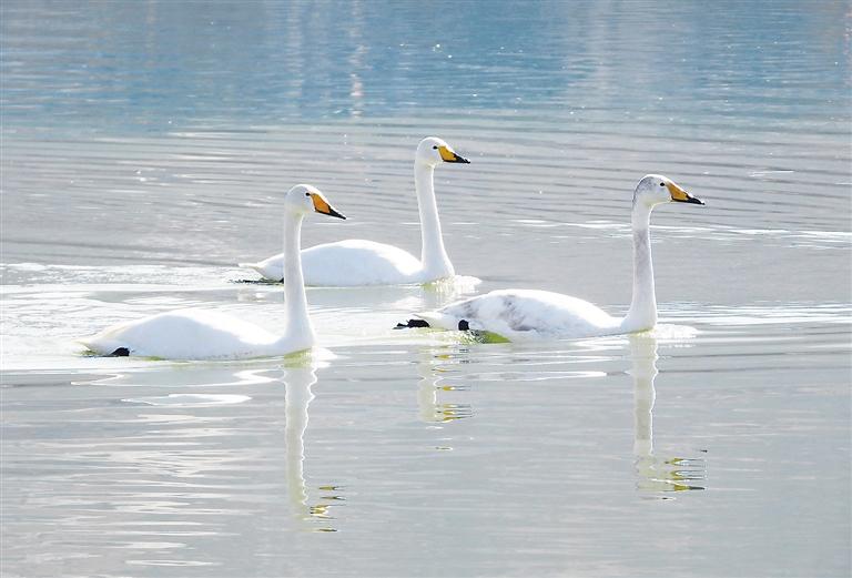 近日,永靖縣鹽鍋峽鎮(zhèn)境內(nèi)的黃河八盤峽水庫成為天鵝等候鳥越冬的樂園,它們在此棲息、覓食,成為冬日黃河里的一道靚麗風景。 本報記者 史有東 攝