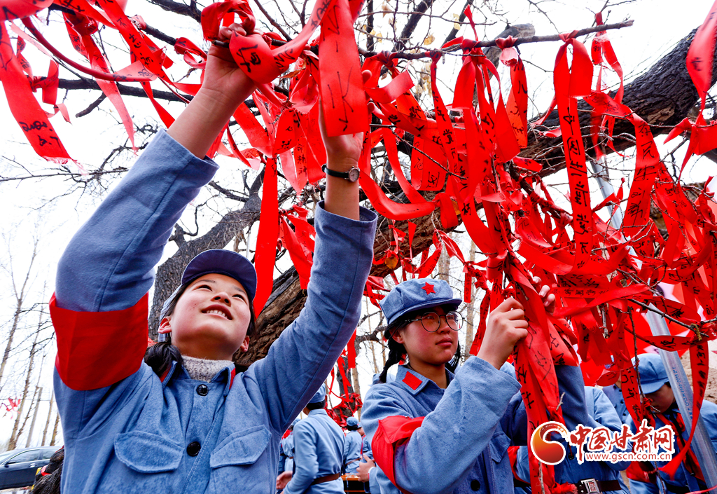 3月31日,甘肅張掖甘州區(qū)龍渠鄉(xiāng)中心學(xué)校的師生在紅軍樹上系上心愿紅飄帶,祝愿祖國繁榮昌盛。