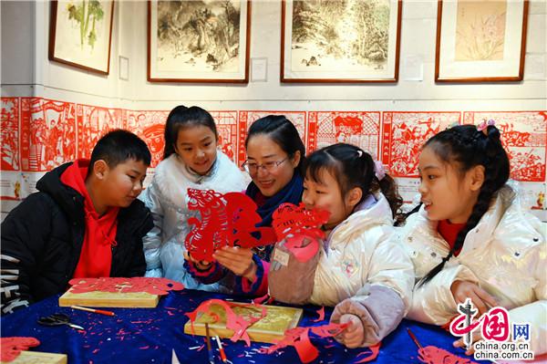 “?;⒆髌废盗卸际俏易约涸O(shè)計創(chuàng)作的,一共18款,每款的造型都不一樣。”1月26日,在位于湖南省新邵縣嚴(yán)塘鎮(zhèn)大源村的非遺剪紙展覽館,邵陽剪紙非遺傳承人馬麗婭帶著幾名萌娃學(xué)習(xí)剪紙,為即將到來的虎年春節(jié)增添一抹喜慶。
