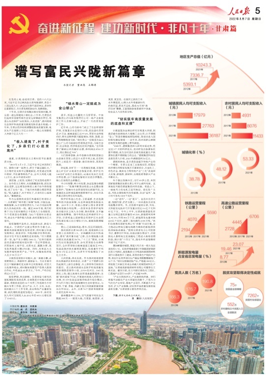 8月7日,人民日報刊發(fā)“奮進新征程 建功新時代·非凡十年”甘肅篇,重磅推出兩塊整版,聚焦黨的十八大以來,隴原兒女牢記習(xí)近平總書記的殷切囑托,踔厲奮發(fā)、銳意進取,埋頭苦干、勇毅前行,加快建設(shè)幸福美好新甘肅,不斷開創(chuàng)富民興隴新局面。