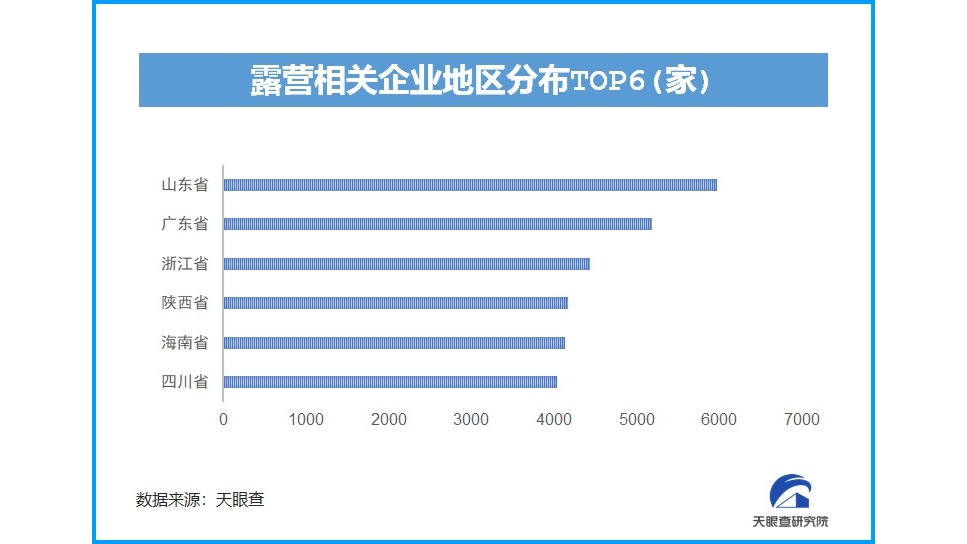 人們被疫情壓抑了的旅游需求,在露營市場(chǎng)得到釋放。根據(jù)天眼查大數(shù)據(jù),我國目前已有超過6.6萬家與露營相關(guān)的企業(yè),近3年露營相關(guān)企業(yè)注冊(cè)總量增長迅猛。在地域分布上,山東的露營相關(guān)企業(yè)數(shù)量最多,近6000家。廣東、浙江、陜西、海南、四川等緊隨其后,均超過4000家。