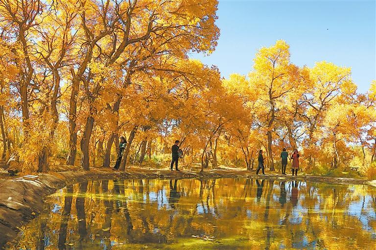 金秋十月,位于敦煌市莫高鎮(zhèn)的胡楊林迎來一年中最美的時(shí)節(jié),金色胡楊在陽光的照射下,顯得更加美不勝收。
