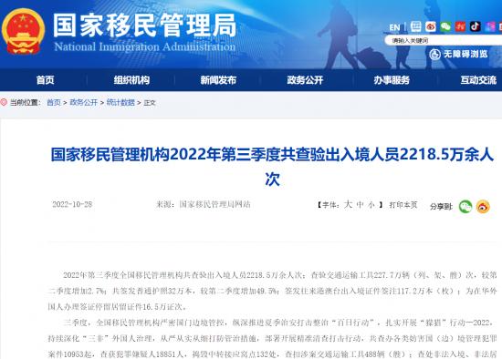 來自國家移民管理局的數(shù)據(jù)顯示,2022年第三季度,全國移民管理機(jī)構(gòu)共查驗(yàn)出入境人員2218.5萬余人次;共簽發(fā)普通護(hù)照32萬本,較第二季度增加49.5%;簽發(fā)往來港澳臺(tái)出入境證件簽注117.2萬本(枚);為在華外國人辦理簽證停留居留證件16.5萬證次。