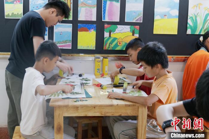 “仔細觀察葉片的形狀、顏色,之后我們要把它畫出來。”與孩子們頻繁互動的是土生土長的畫師吳錦秀。畫社成立后,她和同鄉(xiāng)畫師組成團隊,免費教咸六村孩子們繪畫,傳承技藝。