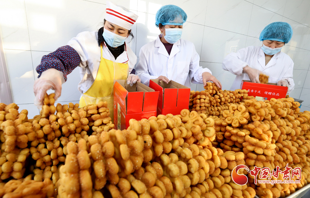 1月10日,在張掖市山丹縣一饃饃制作車(chē)間里,工作人員正在制作“糖花子”。