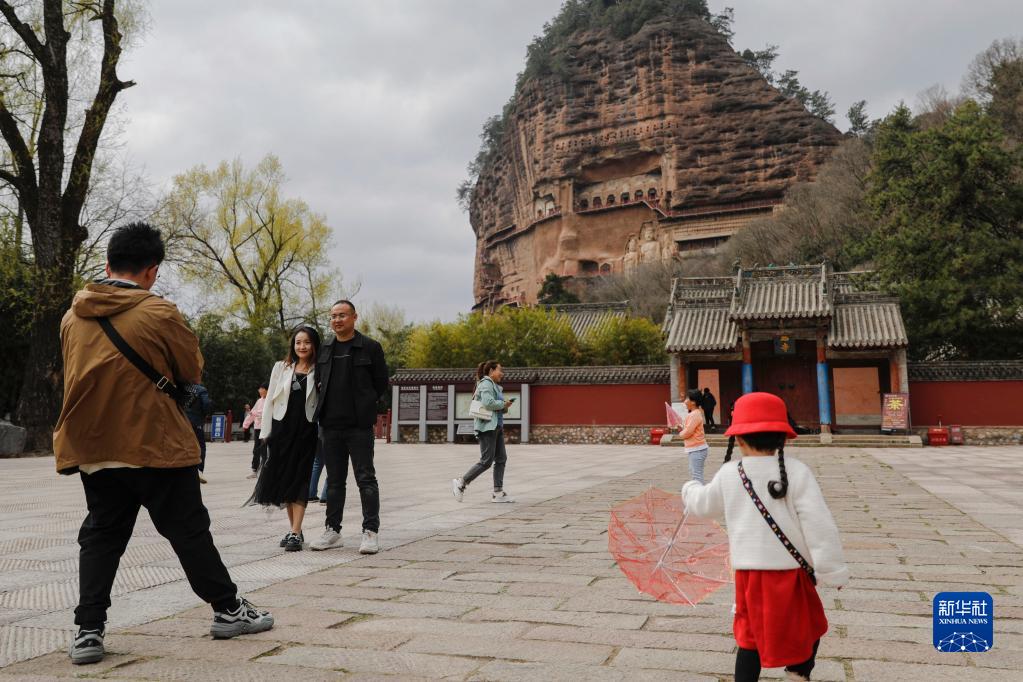 4月1日,游客在麥積山石窟游玩。新華社記者 王鵬宇 攝