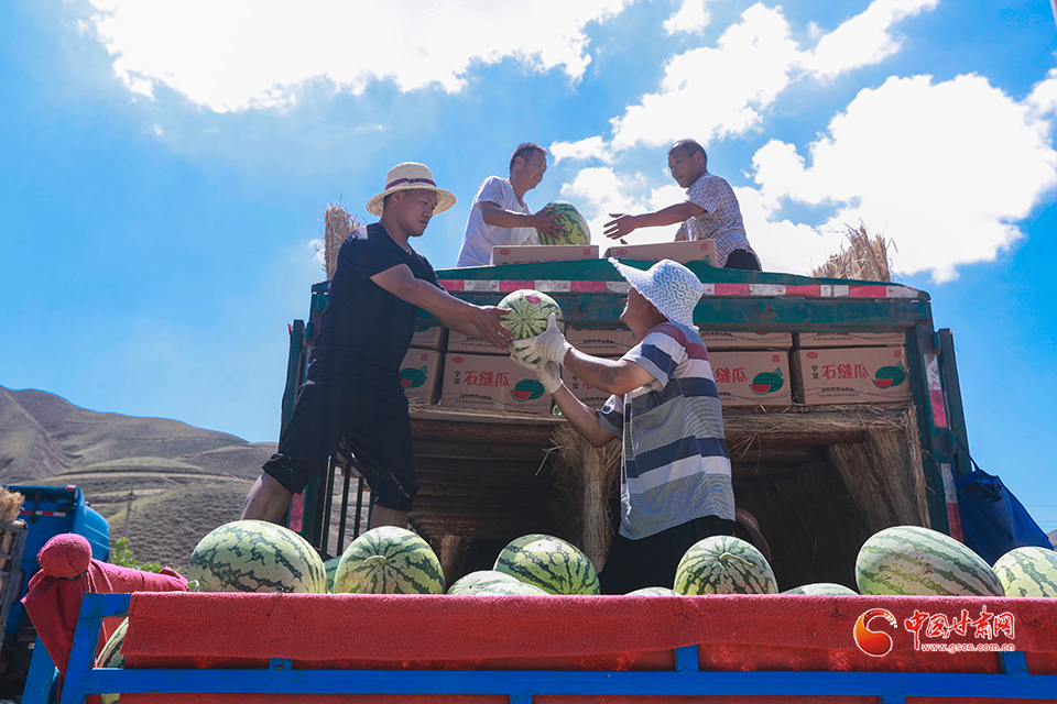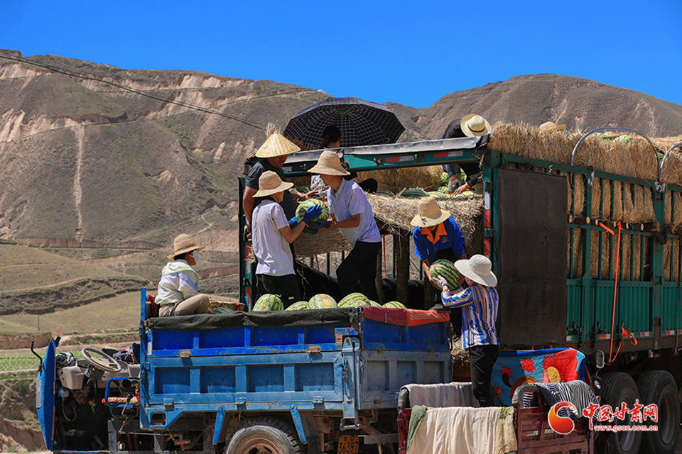 7月31日,甘肅省白銀市會寧縣土高山鄉(xiāng)種植的砂田西瓜喜獲豐收,瓜農(nóng)們忙著采收、搬運、裝車外運,“搶鮮”上市銷售。